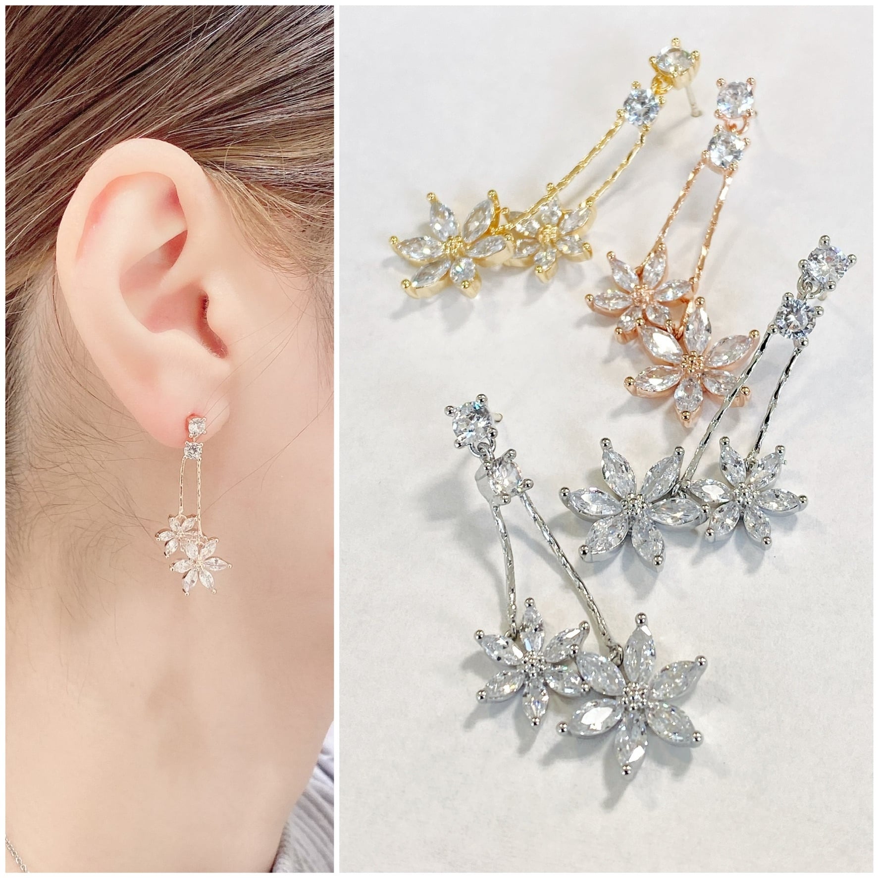 キュービックジルコニアフラワーが2輪並んだピアス/イヤリングです。ピアスはチタンポスト、イヤリングはノンニッケル、