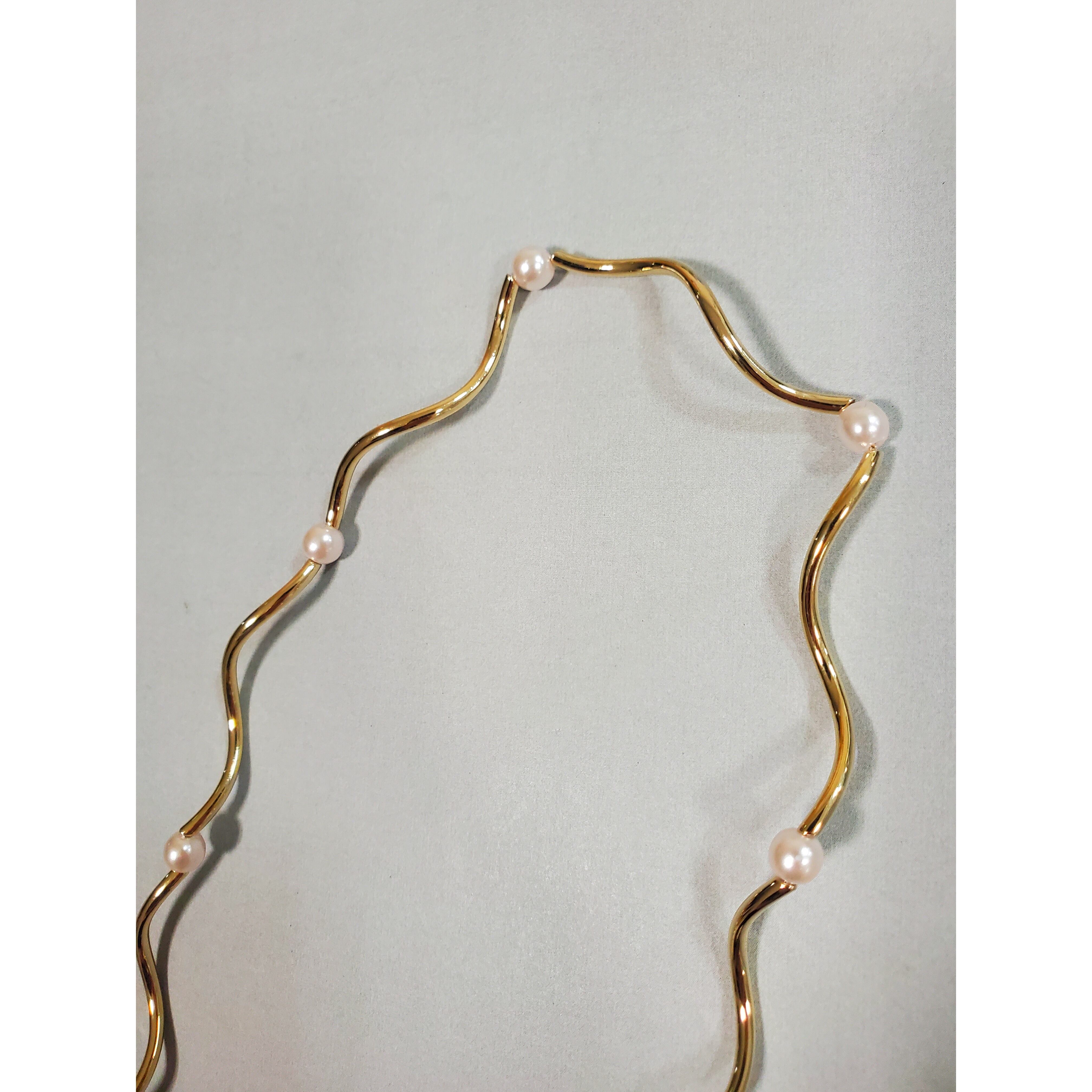 ウェーブしたメタル×パールがポイントのネックレス。留め具がなくスムーズに着用が出来るマンテル型